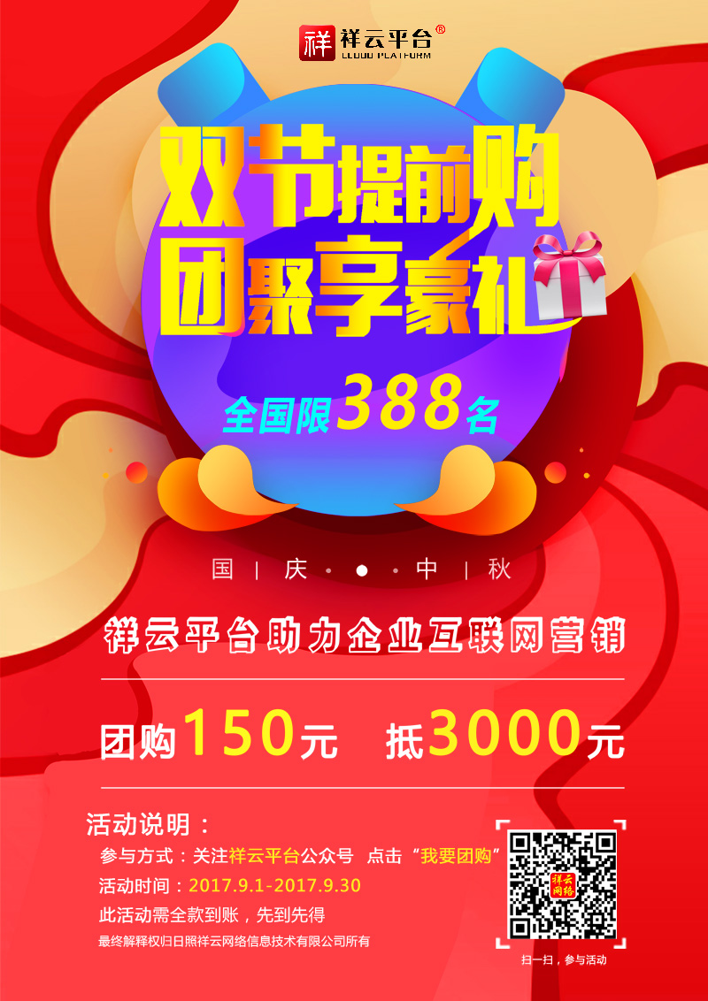 迎中秋,慶國慶,值此雙節(jié)來臨之際,祥云網(wǎng)絡(luò)助理企業(yè)互聯(lián)網(wǎng)營銷,團購150元抵3000元;顒舆M(jìn)行中……